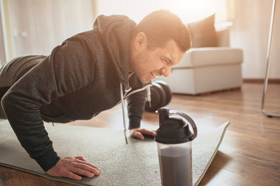 Don a pair of tennis shoes and head outdoors to get your body moving. Start off walking at a brisk pace for 2 minutes. Move into walking lunges for 3 minutes, making sure your forward knee does not go over the toe as you dip down into each lunge. Next, do 20 full pushups on your toes. Do another 3 minutes of walking lunges, then finish off the workout with 15 reps of the following “plank-to-knees” exercise, preferably on the grass or back inside on a mat if you prefer. To execute, start on your forearms with your elbows bent and extend your legs out so you are on your toes. Your body should be in a straight line from the crown of your head to the heels. Inhale as you bend your knees towards the floor and exhale as you extend the knees back to start position.
