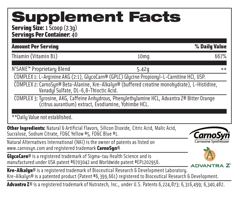 The name says is all! Finally… a pre-workout supplement that works as hard as you do! This pre-workout is not intended for rookies, beginners, or bench-warmer bros sitting at the chest press texting. What it is, is everything you’d ever want in a pre-workout supplement!  So now it’s time to get off your ass and work as hard as THIS pre-workout does. N’SANE™ is designed to push you beyond your limits in the gym and help you destroy those PRs! This hard-hitting, high-energy, stim-heavy formula is not for the weak of heart. Trust us when we tell you, this formula is N’SANE!