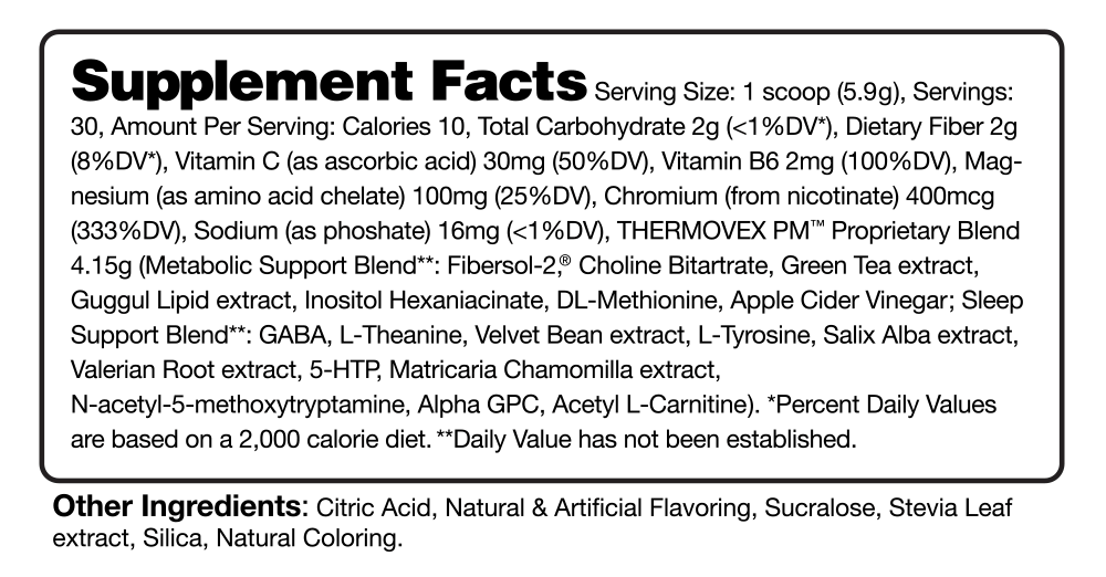 You eat right, you train hard and you’re not afraid to put in the work. You also know the importance of getting enough quality sleep to support your goal of achieving that lean and mean physique is a must!  Missing this critical component can wreak havoc on your goals and your metabolism. That’s why choosing the right supplement before bed is so critical. THERMOVEX PM™ is a Sugar-Free, nighttime metabolic formula that addresses this common issue. Formulated with popular ingredients used by many fitness-minded individuals before calling it a night, THERMOVEX PM™ has quickly become a go-to supplement used regularly by loyal customers. Don’t waste another day of clean eating and a great workout to lack of sleep!