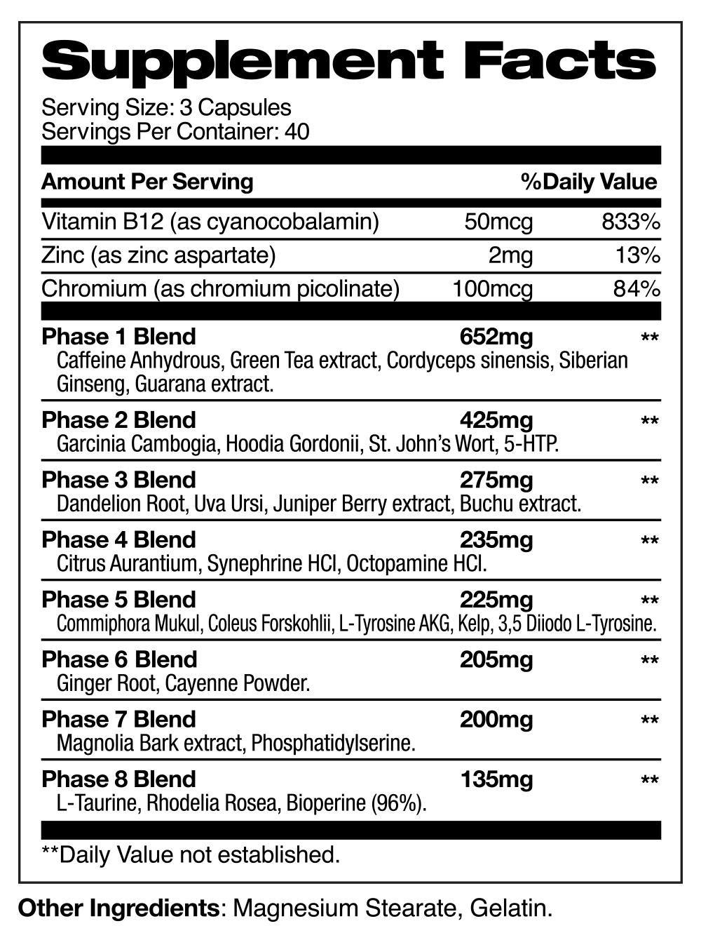 An 8-Phase, advanced formula designed to aid in improving body composition through increased metabolic rate, thermogenesis and increased energy levels.