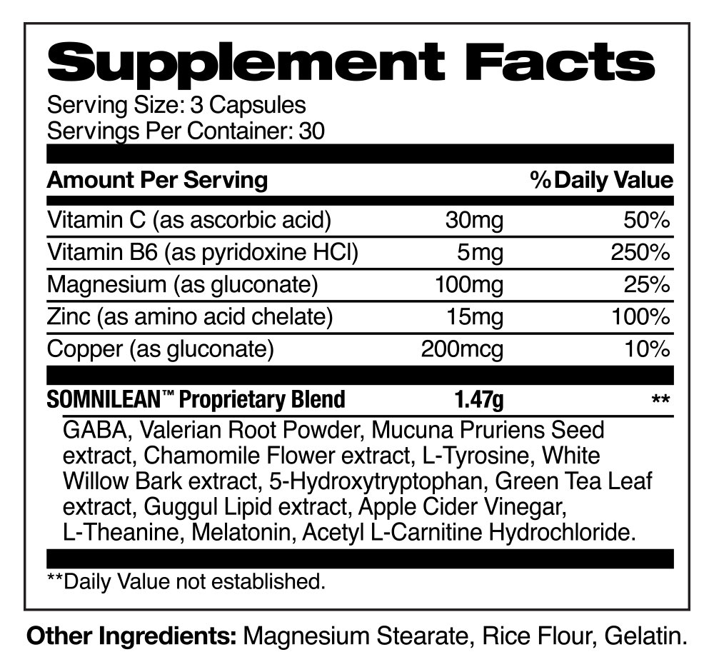 You eat right, you train hard and you’re not afraid to put in the work. You also know the importance of getting enough quality sleep to support your goals is a must! Missing this critical component can wreak havoc on your goals and your metabolism. That’s why choosing the right supplement before bed is so critical. SOMNILEAN™ was formulated specifically to address this common issue. SOMNILEAN™ is an advanced formula that includes GABA, Valerian Root, Chamomile, 5-HTP, and Melatonin. Lean dreams my friends!