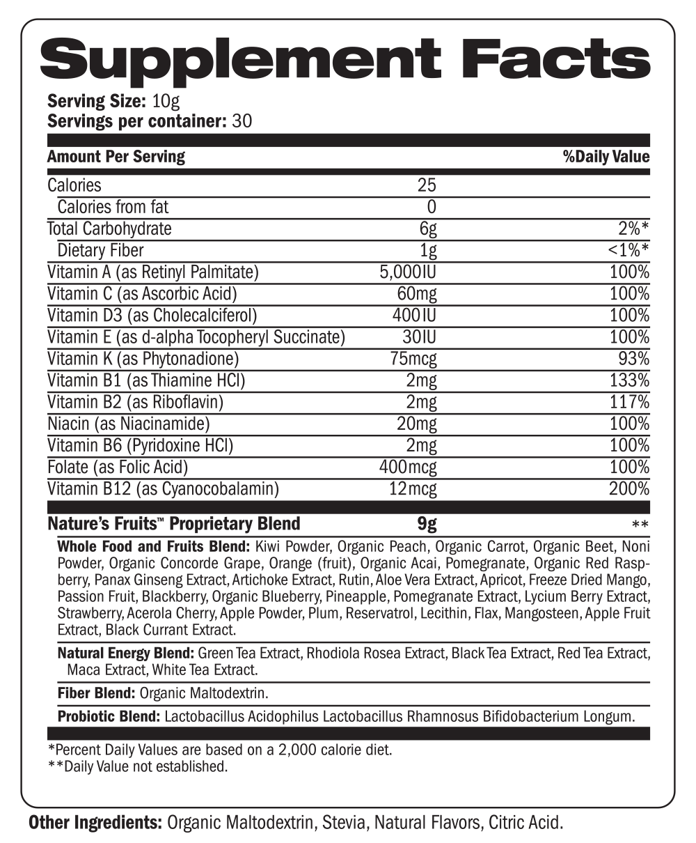 Let’s face it. Most of us do not eat enough of ‘nature’s candy’ on a daily basis yet it’s so good for you. Yes, I’m talking about fruit! Problem solved my friends… Derived from freeze-dried juice powders, NATURE’S FRUITS™ is a great tasting and convenient supplement formulated with 35 Antioxidant based fruits including Acai Berry, Raspberries, Pomegranate and Blueberries to name a few. It contains No Artificial Sweeteners, No Artificial Colors and is Gluten and Sugar-Free! So go ahead, mix yourself up a tall glass of NATURE’S FRUITS™, sit back and enjoy!