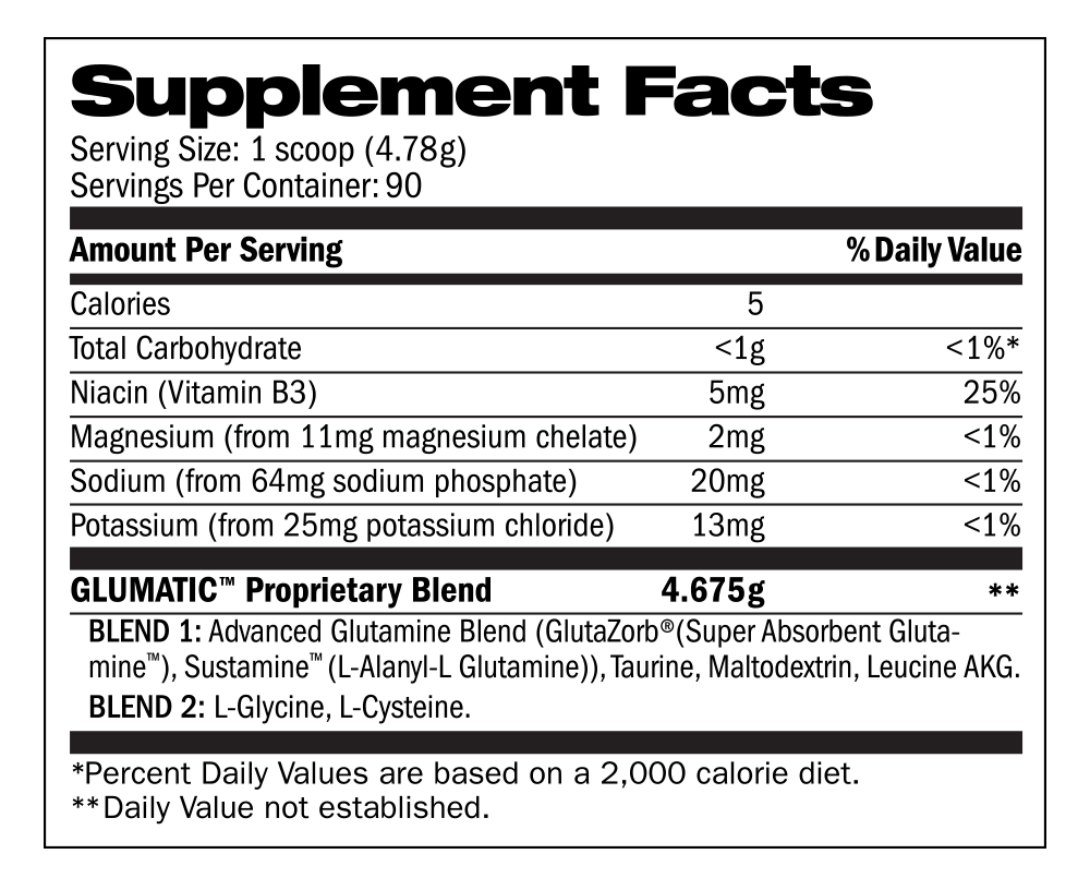 SUGGESTED USE: As a dietary supplement, take 1 scoop in 6–8 ounces of water. For convenience, GLUMATIC™ can be mixed with your pre and postworkout drink or your favorite protein shake.