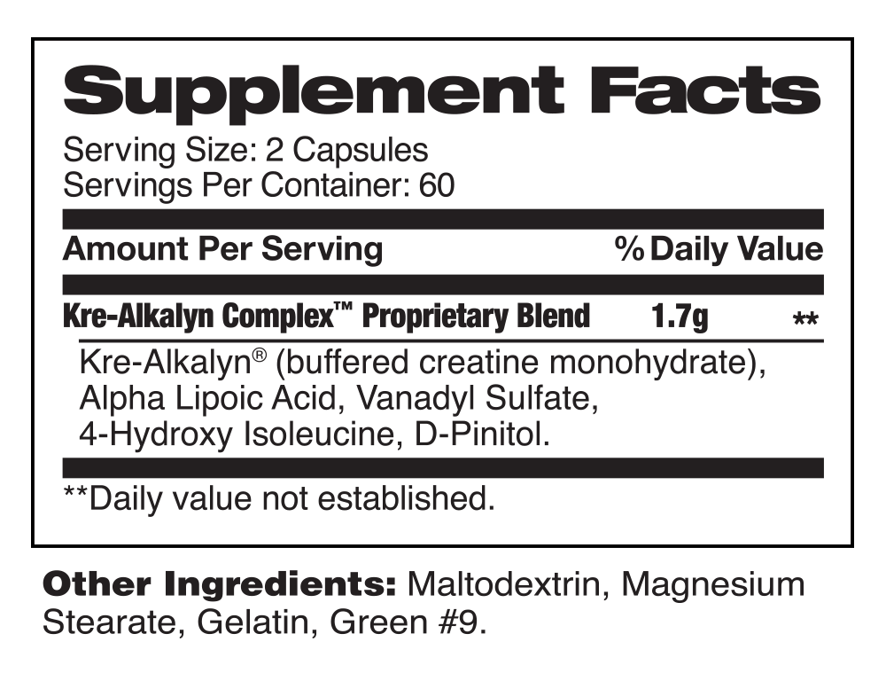 KRE-ALKALYN COMPLEX™ contains a patented buffered creatine transport system utilizing 'pH-Correct'® creatine stabilization technology that has been a tried and true go-to for many fitness enthusiasts over the years. With KRE-ALKALYN COMPLEX™, many experience the benefits of creatine supplementation without the excessive subcutaneous water retention found in some other forms of creatine.